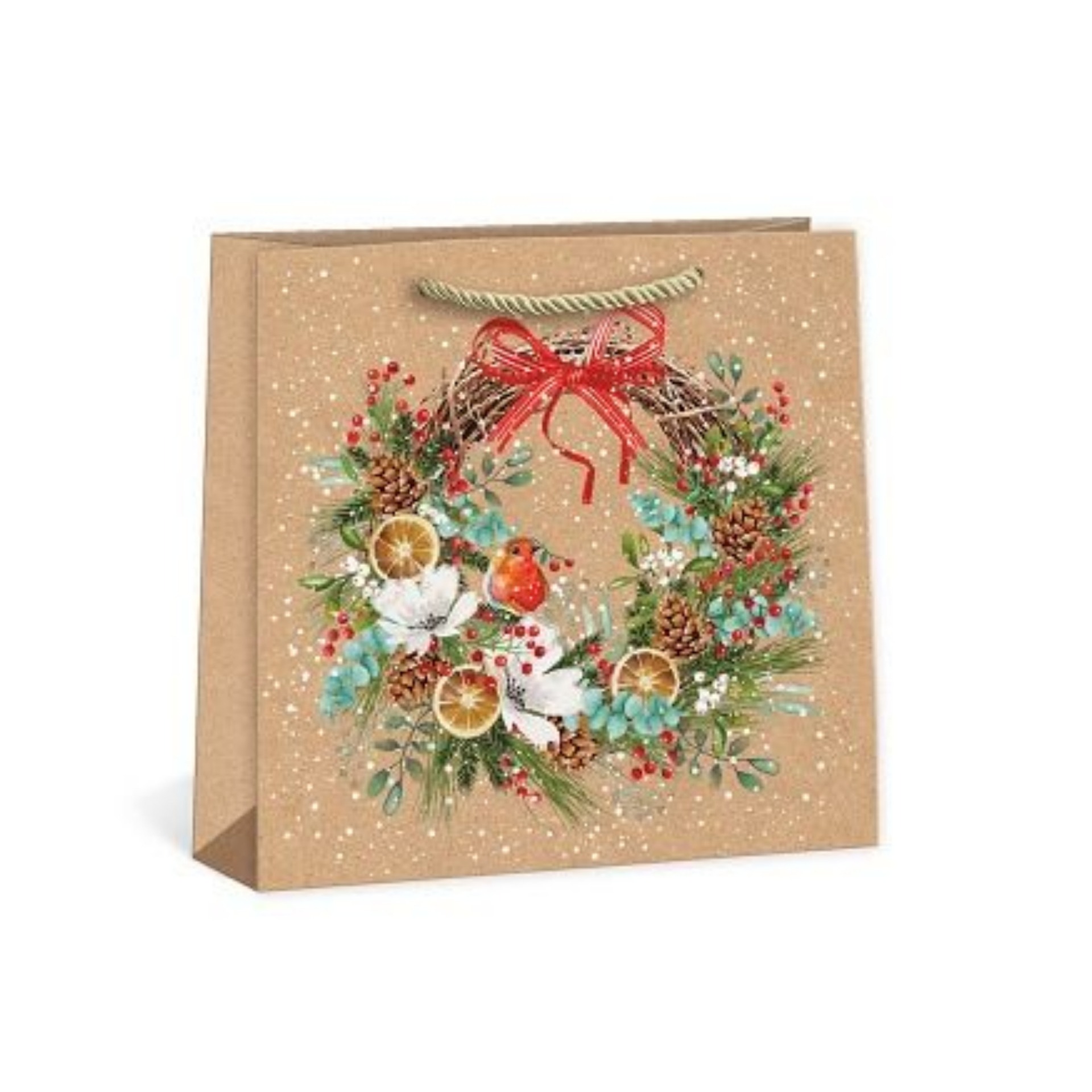 Vianočná prírodná darčeková taška v tvare štvorca s jednoduchou, výraznou potlačou. Vyrobená z kvalitného pevného prírodného papiera na rýchle a praktické zabalenie darčekov všetkých veľkostí. Kvalita spracovania zaručuje dostatočnú pevnosť proti pretrhnutiu dna alebo odtrhnutiu ušiek. Prírodný kraftový papier využívame pri niekoľkých našich výrobkoch označených ako ECO FRIENDLY.
